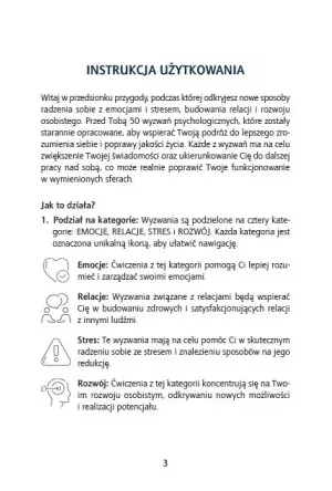 1. Podział na kategorie: Wyzwania są podzielone na cztery kategorie: EMOCJE, RELACJE, STRES i ROZWÓJ. Każda kategoria jest oznaczona unikalną ikoną, aby ułatwić nawigację.