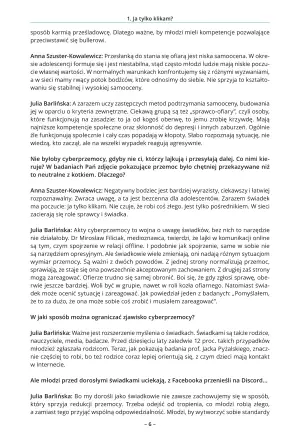 ANNA SZUSTER-KOWALEWICZ: Badania pokazują, że kontakt z siecią oraz narzędziami elektronicznymi nasila pochopność i powierzchowność przetwarzania informacji, przerzutność uwagi i impulsywność zachowań. Mamy do czynienia z warunkami, które w myśl koncepcji Daniela Kahnemana aktywizują system pierwszy umysłu, czyli reakcje mimowolne, automatyczne. Na to nakłada się specyfika okresu adolescencji: młodzi ludzie mają ograniczone jeszcze kompetencje hamowania i odraczania impulsów, a także nierozwiniętą refleksyjność. A zarazem u wielu pojawia się lęk przed odłączeniem od sieci i obawa, że coś ich ominie. A każdy lajk jest wzmocnieniem i szybko tworzy się nawyk, który trudno zmienić.Czym różni się cyberprzemoc od przemocy offline?