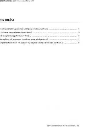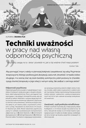 Odporność psychiczna to jeden z najważniejszych czynników chroniących osoby pracujące z drugim człowiekiem, rdzeń wewnętrznej siły. Praca „pomagacza” jest wymagająca i obciążająca, szczególnie wtedy, gdy nie potrafimy zadbać właściwie o naszą kondycję psychofizyczną lub osobistą rezyliencję. Odporność psychiczna to również cecha osobowości, od której w dużym stopniu zależy to, jak radzimy sobie z wyzwaniami, stresorami i presją, niezależnie od okoliczności (P. Clough, D. Strycharczyk, 2015). Model odporności psychicznej zwany 4 C zakłada, iż podstawowymi komponentami odporności są: C (Control) Kontrola, C (Commitment) Zaangażowanie, C (Challenge) Wyzwania, C (Confidence) Pewność siebie. To właśnie te dyspozycje osobowościo we sprawiają, że jesteśmy odporni, dzięki czemu możemy nie tylko radzić sobie z wyzwaniami codzienności, ale i się rozwijać. Każdy z wymienionych komponentów można rozwijać i wzmacniać, a jedną ze skuteczniejszych technik w tym zakresie pozostaje praktykowanie uważności.