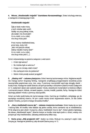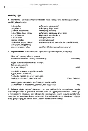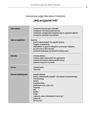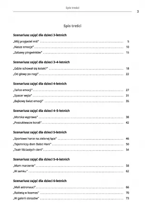 Książka zawiera 18 kompletnych scenariuszy zajęć dla dzieci w wieku przedszkolnym, które dobrane są odpowiednio do wieku. Każdy scenariusz posiada odpowiednio opisane cele ogólne, szczegółowe, metody używane w ćwiczeniach, formy (zbiorowa, zespołowa lub indywidualna) oraz pomoce dydaktyczne, potrzebne do przeprowadzenia ćwiczeń. Opisany jest także dokładny przebieg zajęć. Do scenariuszy dołączono potrzebne karty pracy i załączniki.