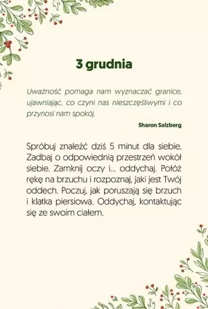 • Zadbasz o praktykę wdzięczności, miłości i akceptacji wobec siebie Nauczysz się słuchać i rozumieć siebie – swoje myśli, emocje, uczucia przez co łatwiej będzie Ci zrozumieć Twoje zachowania i sposoby postępowania w określonych sytuacjach. Odnajdziesz wewnętrzny spokój i zrozumiesz siebie.