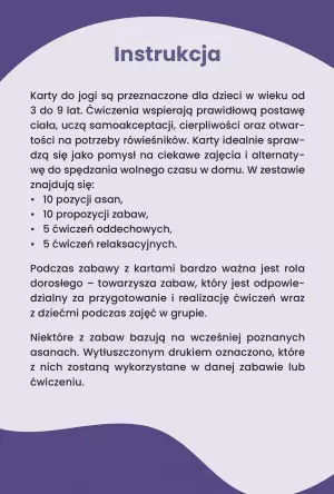 Karty przeznaczone są dla dzieci w wieku 3-9 lat. Zawierają one 10 asan korzystnie wpływających na fizyczny rozwój oraz promujących koncentrację i świadomość. W zestawie przygotowaliśmy również 10 gier rozwijających wyobraźnię i zdolności społeczne.