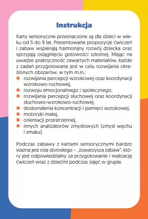 Wydawnictwo Charaktery przygotowało 31 ćwiczeń i zabaw stymulujących rozwój SI dzieci wieku 5-9 lat. Podczas zabawy z kartami sensorycznymi bardzo ważna jest rola dorosłego – „towarzysza zabaw”, który jest odpowiedzialny za przygotowanie i realizację ćwiczeń wraz z dziećmi podczas zajęć indywidualnych, czy grupowych.