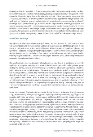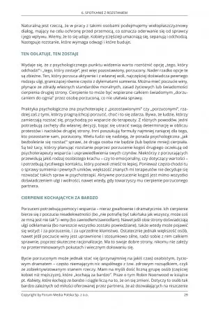 Wydaje się, że albo my spotykamy kogoś, albo „coś” spotyka nas. To „coś” oznacza ważkie, uwewnętrznione doświadczenie. Spotkanie kogoś ważnego oznacza drgnienie w nas samych, rodzą się emocje, jest akcja i działanie. W tym drugim przypadku – gdy nas coś spotkało – jesteśmy raczej bierną stroną zdarzenia. Mam na myśli wydarzenia nie tylko nieoczekiwane, ale też niechciane. Fascynacje i uczucia burzące porządek, który zbudowaliśmy w zgodzie ze sobą i z wyborami służącymi naszemu życiu. Jakieś niespodziewane zauroczenia, rozbudzenia zmysłów... Dla większości z nas najbardziej ekscytujące są spotkania z osobami, o których myślimy, że ubogacą nasze życie o nowe doświadczenia, porządki i cele życiowe, przydadzą mu sensu, wraz z przyjemnością i satysfakcją obcowania zarówno z ludźmi, jak i z własnym samospełnieniem. „Pamiętamy te spotkania, w których dokonało się coś ważnego dla nas, które dały nam klucz do zrozumienia naszej historii. Dzięki nim dotarliśmy do jakiejś prawdy o sobie i świecie, i dokonała się w nas jakaś zmiana” – piszą Maria Anna Oleś i Piotr K. Oleś. Nic dziwnego, że rozstania z tymi osobami są najtrudniejsze. I nieważne, czy jest to rozstanie, o którym sami decydujemy, czy też wyznaczone przez ślepy los. Tak naprawdę rozstajemy się wtedy z własną, żywą jeszcze – przynajmniej w pamięci – nadzieją i pragnieniem spełnienia tego, co już pozostanie niespełnione. Bywa też inaczej. Zdarzają się rozstania dobre dla nas, pożądane i przyjmowane z ulgą lub radością. Istnieje ulga wyjścia z opresji przemocy domowej. Ulga wyjścia ze związku, który stał się jałowy i wyczerpujący, zaś ludzie, którzy w nim trwają, nie potrafią go już ani przemienić, ani ulepszyć. Zwykle jednak nawet takie – chciane – rozstanie bywa trudne, bo jest rozstaniem z jakąś częścią siebie samego. Bierzemy tu „rozwód” z własną nadzieją i przywiązaniem do niej, z jakimś marzeniem, własną naiwnością i idealizacjami, z częścią siebie egocentryczną lub tą zachłanną. Nawet mądra i uzasadniona rezygnacja z relacji, czy też najbardziej racjonalna ucieczka są w efekcie doświadczeniem osamotnienia, mimo wszystko opuszczenia. Przykładem są tu ofiary przemocy domowej, które z jednej strony chcą uciec od opresyjnej sytuacji, zaś z drugiej strony boją się, że nie poradzą sobie w życiu bez sprawcy, którego spostrzegają jako silnego, zaradnego i skutecznego życiowo, w przeciwieństwie do siebie samej – słabej i niewiele wartej istoty... Niektóre z nich obawiają się kryzysu wartości, „przysięgałam, że go nie opuszczę aż do śmierci”.