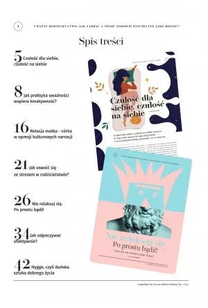 zachowania otaczających nas ludzi. Ponadto wiadomo, że już malutkie dzieci współodczuwają emocje dorosłych. Jeśli więc pragniemy spokoju i równowagi psychicznej dla naszych dzieci, trzeba nam zacząć od siebie, przy czym istotne jest, by zadbać zarówno o umysł, jak i o ciało. Warto wsłuchać się w jego potrzeby, począwszy od oddechu, bo jeśli będziemy podążali za własnym oddechem, zarówno my, jak i nasi bliscy, poczujemy, że żyjemy pełnią życia. Człowiek pytany o to, co