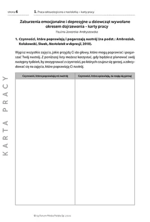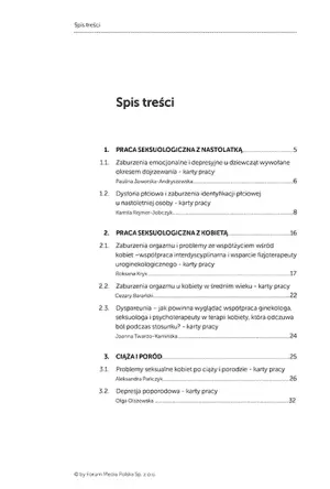 Karty pracy obejmują szeroki zakres tematów – od problemów emocjonalnych i tożsamościowych u nastolatek, przez zaburzenia orgazmu i dyspareunię, aż po trudności seksualne związane z ciążą i okresem poporodowym. Każdy moduł został opracowany przez doświadczonych specjalistów, którzy dzielą się sprawdzonymi narzędziami terapeutycznymi i wskazówkami do ich skutecznego zastosowania w pracy z pacjentkami.